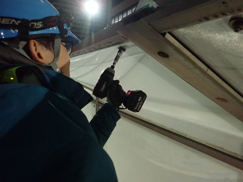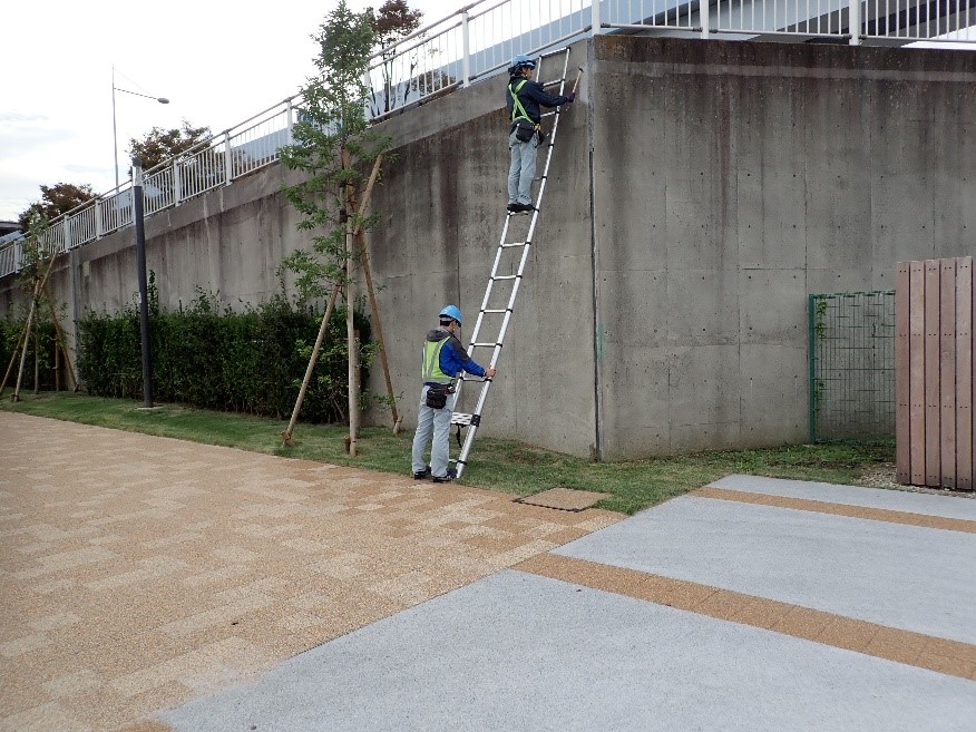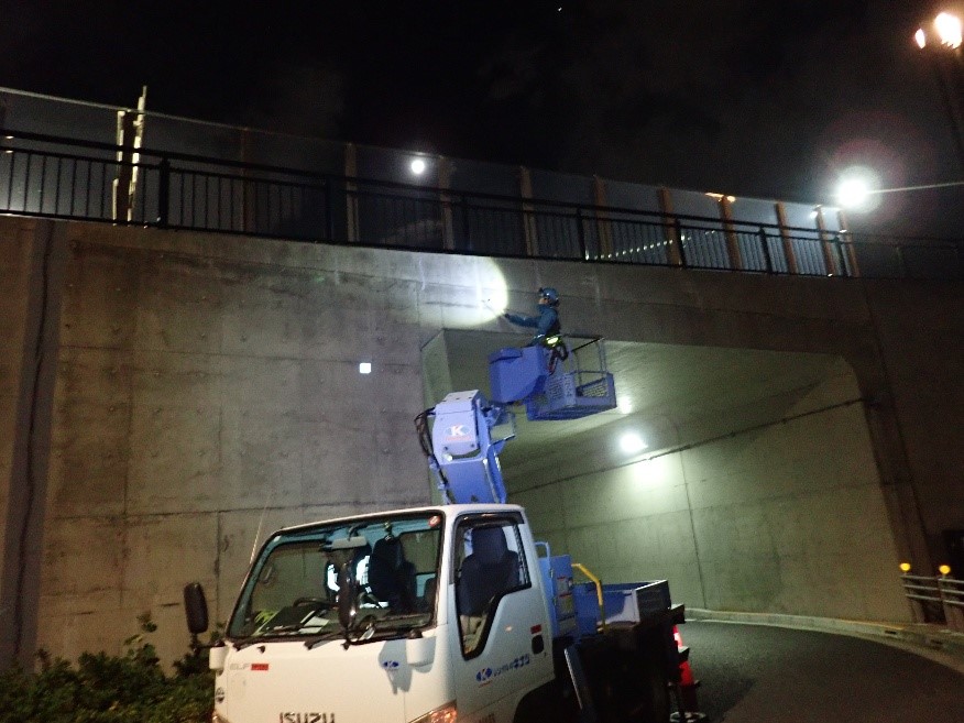 この業務では、対象路線の道路施設である擁壁、函渠、遮音壁の点検を行いました。遮音壁は地上から近接出来ないため、高所作業車を用いて目視点検を行い、ボルトのゆるみ等は触診にて確認しました。 擁壁や函渠では、地上から梯子を使用し、ひび割れや漏水等の変状を目視で確認しました。 点検後は、健全性の判定を行い路線の道路施設の状態を考察しました。早急に対応が必要な施設に対しては、簡易対策工を検討しました。