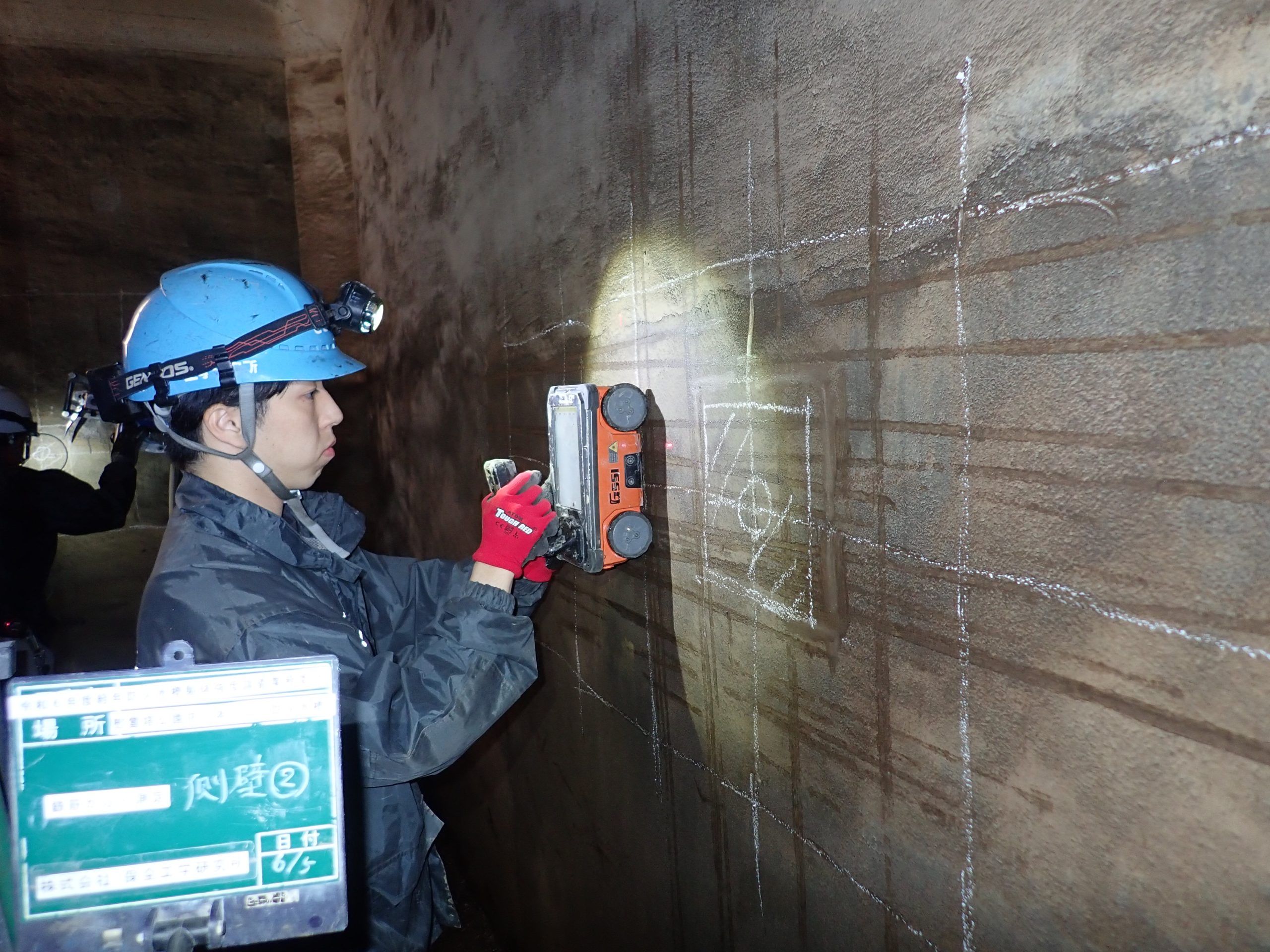 また、コンクリート壁面をハツリ、鉄筋を露出させ、鉄筋径、被りを計測し、衝撃弾性波法で壁厚の計測を行い、躯体形状が設計通りであることを確認しました。